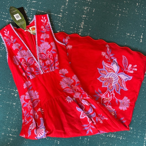 Vibrant red dress with intricate floral embroidery. Sleeveless design. Perfect for summer outings.