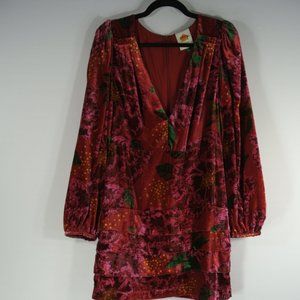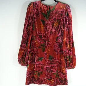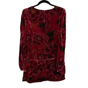 Vibrant red mini dress. Features floral pattern. Long sleeves with a V-neckline. Perfect for any occasion.