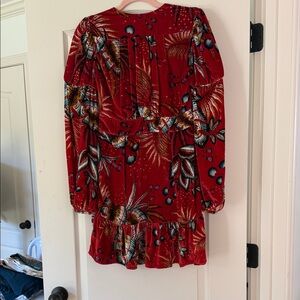Vibrant red mini dress with floral pattern. Long puff sleeves. Perfect for a bold look.