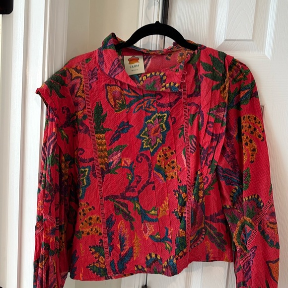 Vibrant floral print blouse by FARM Rio. Cropped silhouette with long sleeves. Button-front panel details. Lightweight textured fabric. Bold colorful pattern for statement looks.