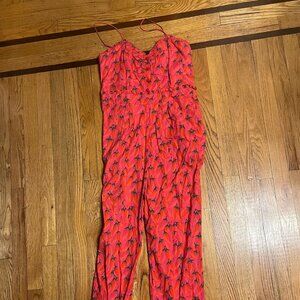 Vibrant red jumpsuit with a playful pattern. Sleeveless design. Perfect for a bold look.