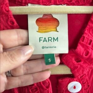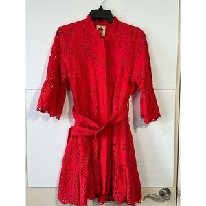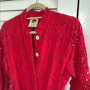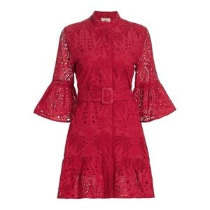 Super classy and fabulous red eyelet mini dress from Farm Rio. Features a belted waist and flared sleeves. Perfect for any occasion.
