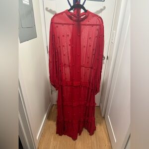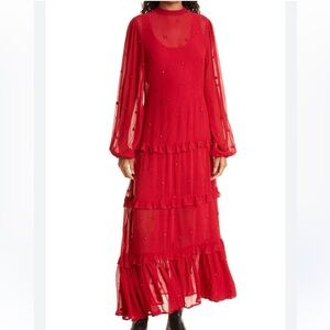 Elegant red maxi dress. Features long sleeves and ruffle details. Perfect for any occasion.