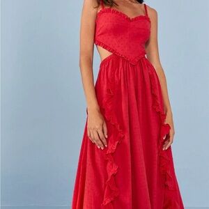 This striking red sundress by FARM Rio features a captivating cut-out design and ruched detailing, perfect for making a statement at weddings or cocktail events. The sleeveless dress boasts a sweetheart neckline with spaghetti straps, offering a modern twist to a classic silhouette. Its vibrant color and elegant style make it an ideal choice for special occasions.