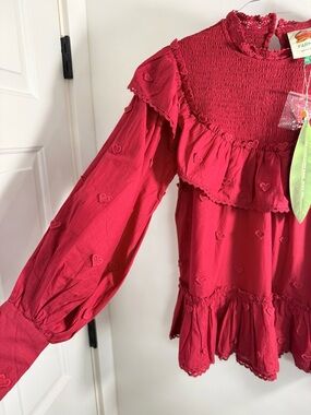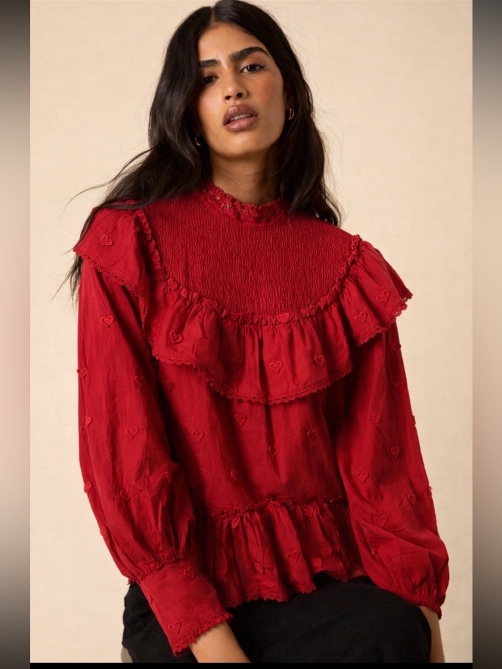 The romantic tiered ruffle yoke and peplum hem add that signature feminine, boho-luxe vibe, while the subtle embroidered heart details throughout make it extra special and unique. The sleeves are softly voluminous with gathered cuffs—effortless and chic.