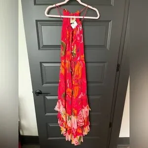 Embrace the vibrant spirit of resort wear with the FARM Rio Red Tiered Ruffled Sundress. This sleeveless maxi dress features a striking high-low hemline and delicate spaghetti straps, perfect for a casual day out. The bright red hue, accented with warm orange tones, adds a lively touch to its tiered, ruffled design. Crafted for comfort and style, this sundress is an ideal choice for a relaxed, yet chic look.