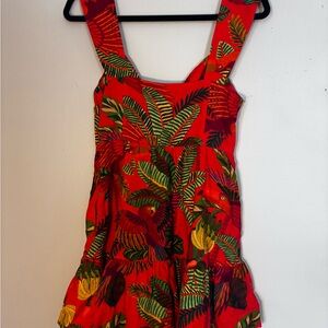 Vibrant mini dress with tropical leaf pattern. Features bold colors and button details. Perfect for a lively look.