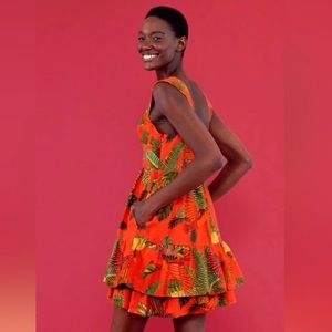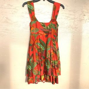 Vibrant red mini dress. Tropical leaf and bird pattern. Sleeveless with wood button details. bustier neckline, fully lined. double layer of ruffles & has pockets!