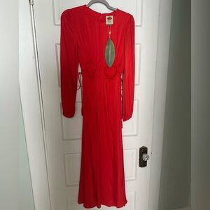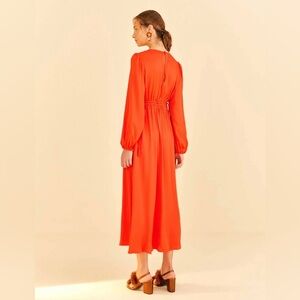 The FARM RIO Viscose Satin Midi Dress is crafted from 100% viscose. It features a round neck, long sleeves, and a midi length. The dress has a cutout at the waist and is designed for a flowy silhouette. It can be machine washed on a gentle cycle, but should not be bleached, tumble dried, or dry cleaned with trichloroethylene. Iron at medium heat and line dry.