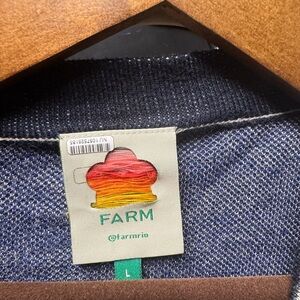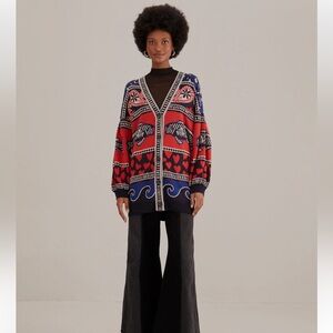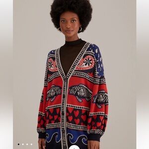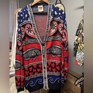 Vibrant cardigan with bold patterns. Features red and blue hues. Eye-catching design with animal and heart motifs.