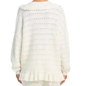 Elegant cream cardigan with ruffled edges. Button-up front. Soft knit texture.