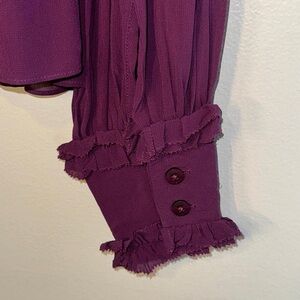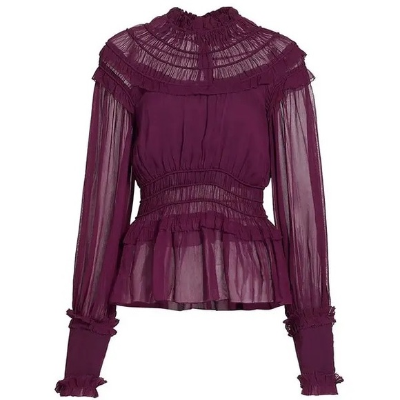 Sheer long-sleeve blouse with layered ruffle yoke. Smocked waist and cuffs for a fitted shape. Lightweight, airy fabric with feminine peplum hem. Sophisticated rich plum tone for evening or dressy days.