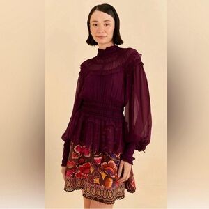 FARM Rio Ruffled Sheer High-Neck Blouse - Deep Plum