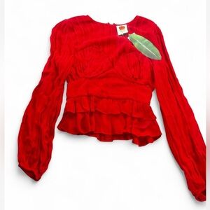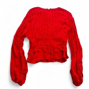 Chic scarlet blouse with layered ruffles. Long sleeves and elegant fit. Ideal for versatile styling.