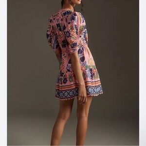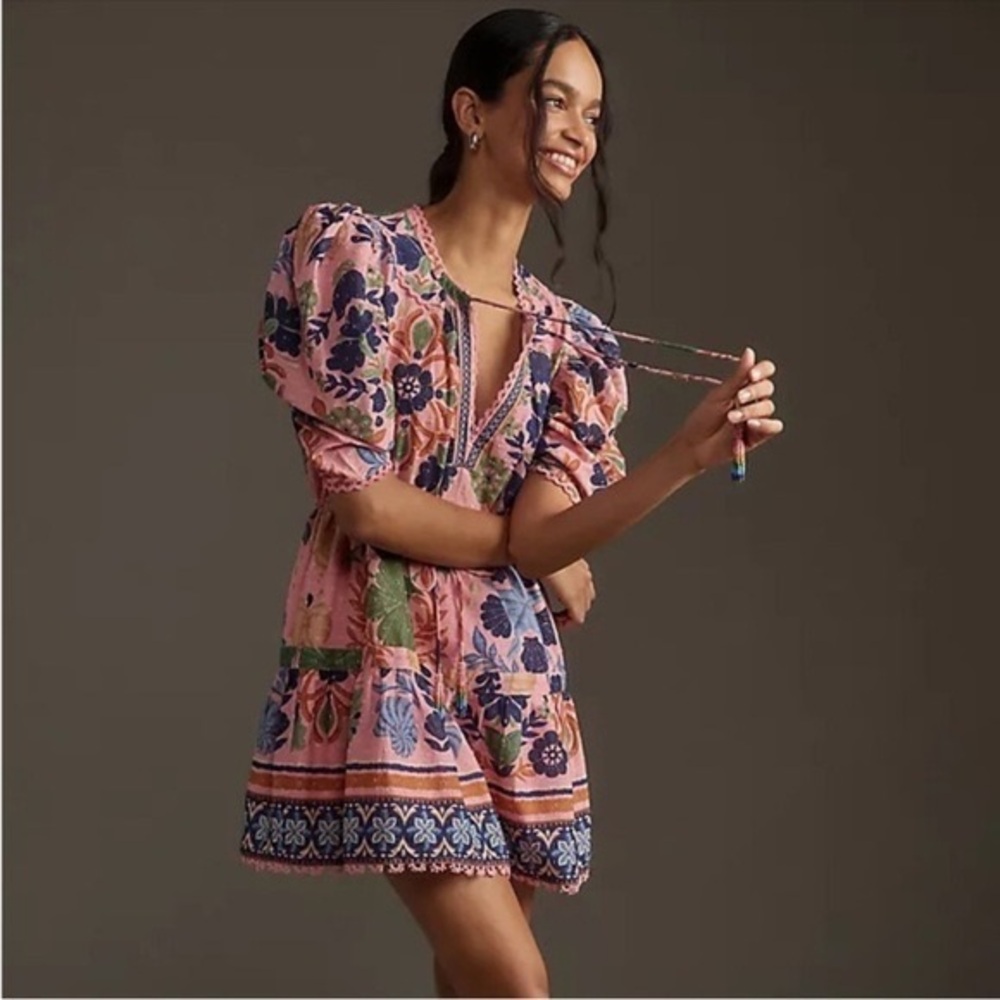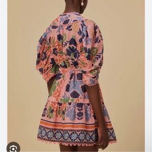 Chic floral mini dress with puff sleeves. Features a vibrant mix of colors.