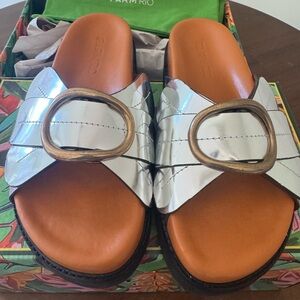 Chic FARM Rio slides with metallic silver straps. Bold orange soles. Features a striking gold buckle.