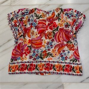 Vibrant floral blouse by FARM Rio. Features a mix of red, pink, orange, and green hues. Short sleeves with a relaxed fit. Perfect for a bold, stylish look.