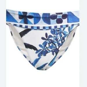 Stylish bikini with tropical blue patterns. Features lace-up front and band waist bottoms. Perfect for beach days. Top is a Large, bottoms are a medium.