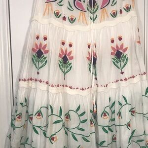 Please look over all photos: Stock photos show a lace band around the skirt that was removed due to the skirt being too long and not wanting to take away from the integrity of the embroidery of the piece.