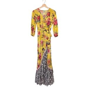 FARM Rio Sunlit Floral Maxi Surplice V Neck Ruffle Hem Wrap Dress Yellow XXS