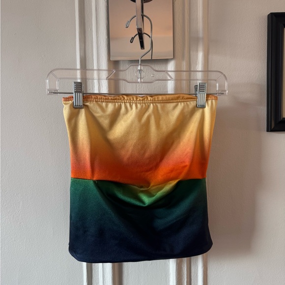 Bold tube top with a sunset gradient. Features orange, green, and navy tones.