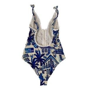 FARM Rio white and blue one piece swimsuit with crochet detailing, low back, and scalloped edges. Brand new