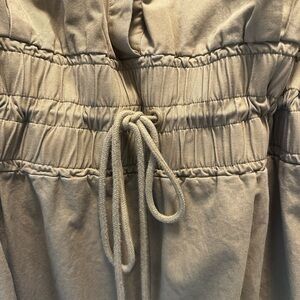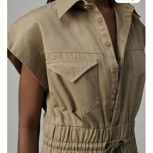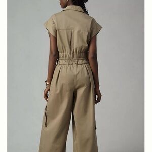 Stylish tan jumpsuit by FARM Rio. Features short sleeves and drawstring waist. Perfect for casual outings.