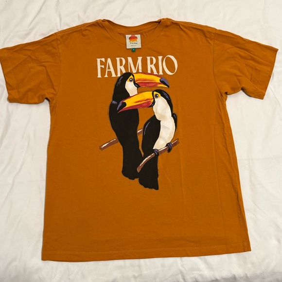 FARM Rio t-shirt featuring toucans. Bold mustard shade. 100% cotton. Great condition.