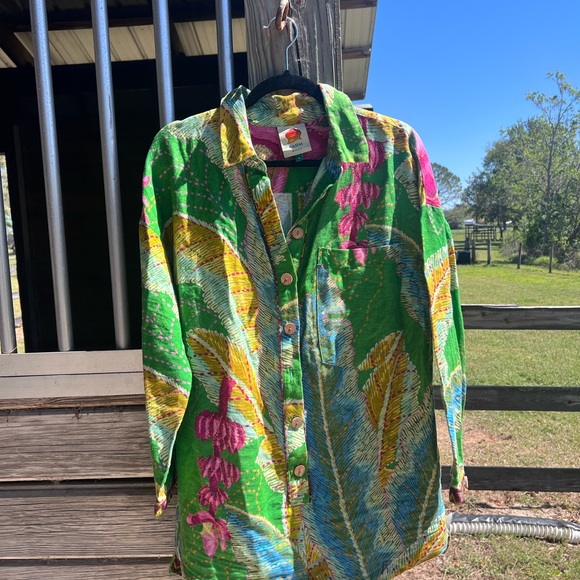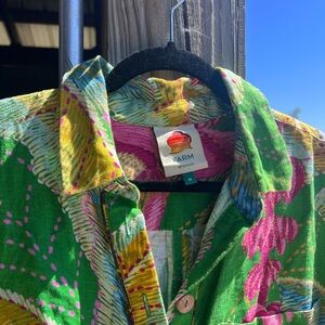 Embrace the vibrant energy of the tropics with this FARM Rio romper, showcasing a stunning blend of green and yellow hues. The lightweight fabric and bold, leafy patterns make it a standout piece for any occasion. Its relaxed fit ensures both comfort and style, perfect for those who love to make a statement.