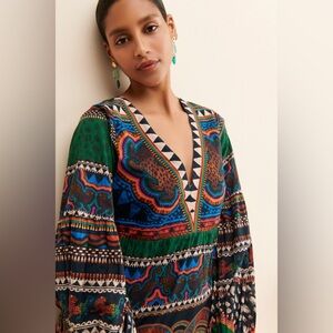 FARM Rio V-Neck Printed Tunic Dress in Green Size Extra Small.