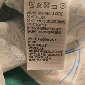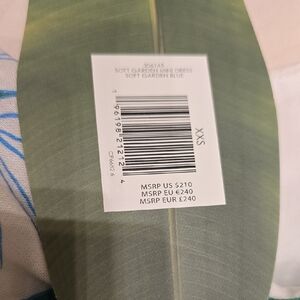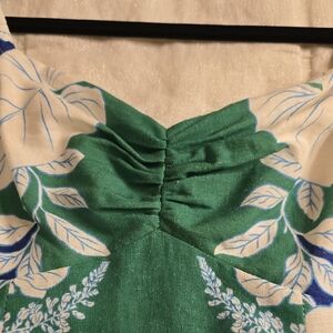 Elegant long sleeve dress with striking floral pattern. Features vivid blue and green tones. Perfect for any occasion.