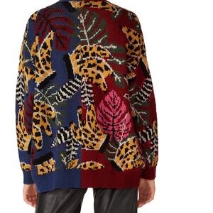 Colorful cardigan with striking leaf design. Features rich red, deep blue, and warm yellow hues. Adds a lively touch to any outfit.