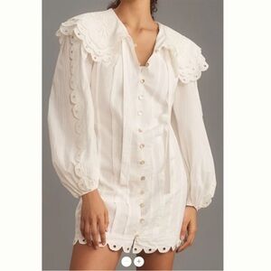 Elegant white mini dress with scalloped edges. Features button-down front and long sleeves. Perfect for any occasion.