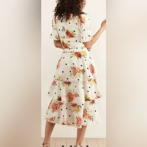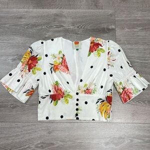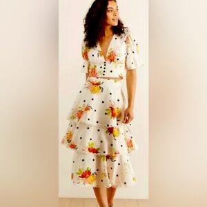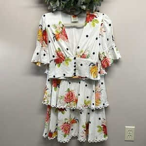 FARM Rio White Nanaju Midi Tiered Skirt & Deep V Crop Puff Sleeve Blouse S/M