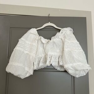 Elegant white crop top with ruffled details. Features intricate lace patterns. Perfect for a chic look.
