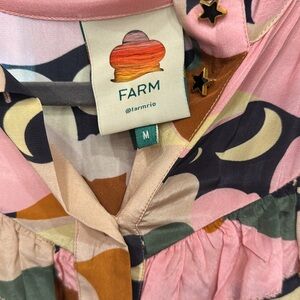 Summer closet clean out. EUC . Vibrant blouse with playful ruffles. Features pink, brown, and green patterns. Ideal for casual or chic wear. 100% Viscose