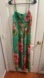 Vibrant green jumpsuit with floral print. Features pink and orange flowers. Spaghetti straps and relaxed fit.