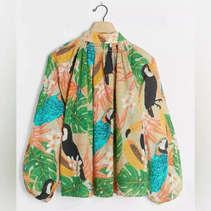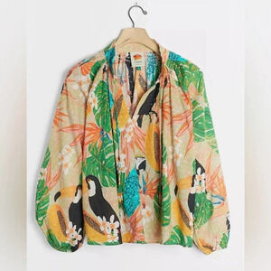FARM Rio Women’s Tropic Parrot Bohemian V-Neck Beaded Tie, Puff Sleeves Blouse Top Tunic Orange White, Green, Black, Yellow Pullover. Size: Medium ***Styled on a size 4 mannequin***Belt sold separately***