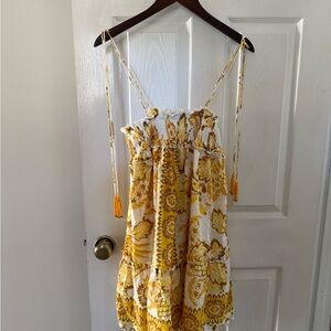 Vibrant yellow floral pattern. Spaghetti straps with tassel details. Perfect for sunny days.