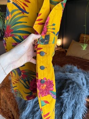 Vibrant yellow romper with bold tropical floral and parrot print. Adjustable straps and a relaxed, playful silhouette. Lightweight fabric ideal for warm days and layered styling. Eye-catching colors add lively, vacation-ready flair.