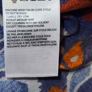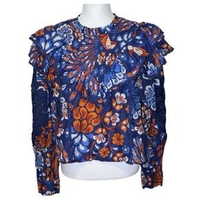 FARM Rio long sleeve blouse with puffy, ruffled shoulders. Colors are blue, orange, and white. Size Large. VGUC. Please see pictures for details.