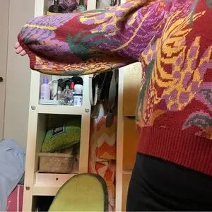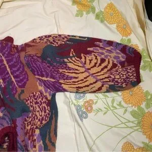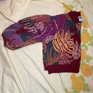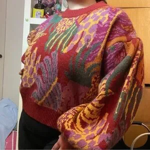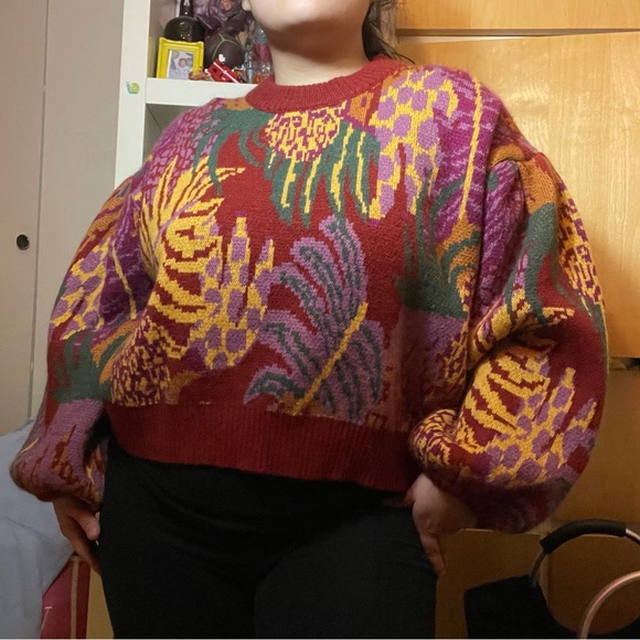 Chunky sweater by the brand FARM Rio. Colorful and warm. Super bulky. The sleeves are puffy as well.