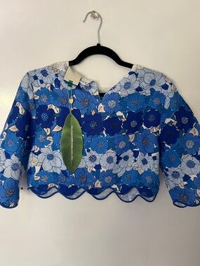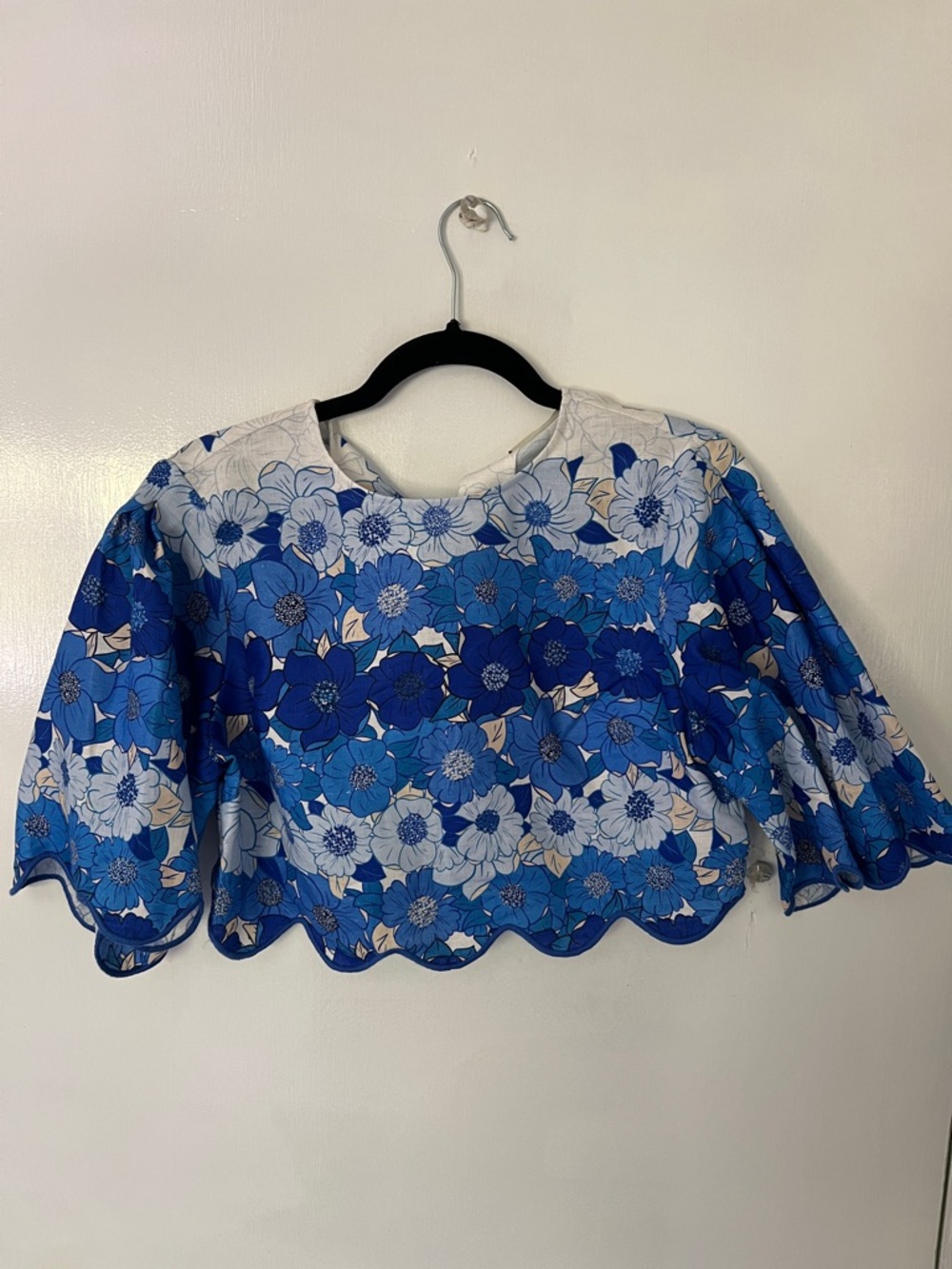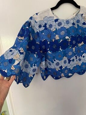 Lightweight cropped top featuring an all-over blue floral print. Scalloped hem and short bell sleeves add feminine detail. Easy pairing piece for casual or dressy looks. Vibrant blue tones brighten your wardrobe.