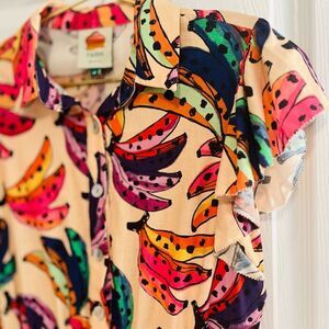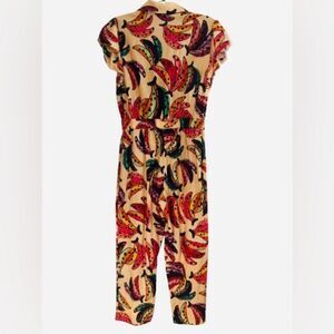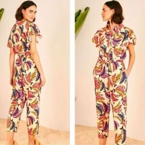 Step into style with FARM Rio's jumpsuit, showcasing a delightful blend of pink and cream hues. The ruffled short sleeves and elegant mandarin collar elevate its sophisticated design. Ideal for any occasion, this jumpsuit promises both comfort and flair.
