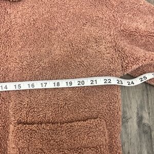 Cozy FARROW teddy sherpa cardigan coat in a soft pink-rose brown tone, women’s size M. Plush and warm with a relaxed fit that layers easily over sweaters and tees. Features a full zip front, fold-over collar, and two front patch pockets for a casual, comfy look. Perfect for fall and winter errands, lounging, or everyday wear. Excellent condition with no flaws noted. From a smoke free home.