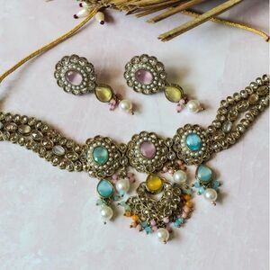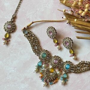 Reverse AD stones on mehndi polish necklace set with tikka.