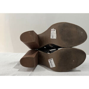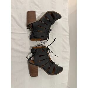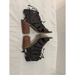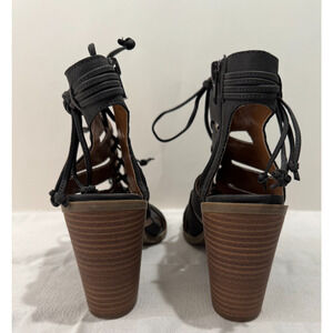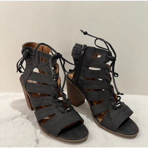 FARYL By Faryl Robin BUCKLE Black Sandals Heels Caged Lace Up Sz 8 Vegan Suede