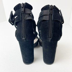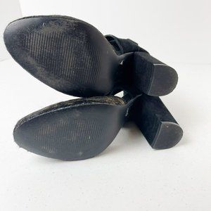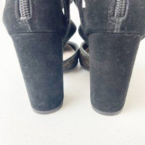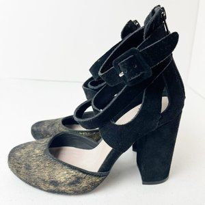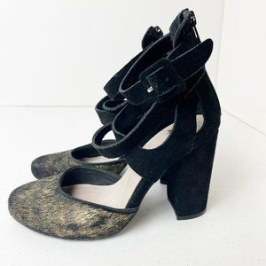 Faryl Robin X Anthropologie Black and Gold Vegan Suede and calf Hair Atwood Heels. MSRP: $128. Black Ankle Straps. Back zip closure. Stock Photos are to show style only-- these are gold and black. Excellent Preowned Condition. Size 7.