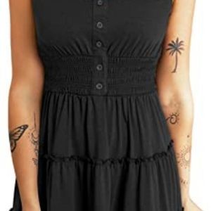 Feature: Mini dress for women comes with Sleeveless, Decorated Buttons Front, Scoop Neck, Smocked Waistband, Elastic High Waist, Flowy Ruffle Tiered, A-Line Dress, Tank Dress Design, Ruffle Skirt, No Pockets, Short Length, Solid Color, Dresses fits for any body shape, Your best choice for summer.