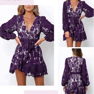 Features: Womens mini dress with belt, wrap deep v neck,lace floral,long sleeve,mini length,pom pom decoration,bowknot design,A-Line, slim fit